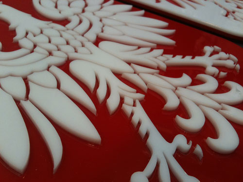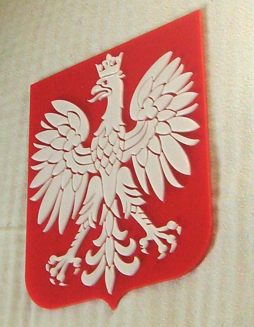 Najlepiej, wizualnie, przedstawia się orzeł wycinany w pleksi barwionej, białe elementy orła po wycięciu zostały naklejone na czerwoną tarczę i powstał efekt przestrzenny, naśladujący płaskorzeźbę.