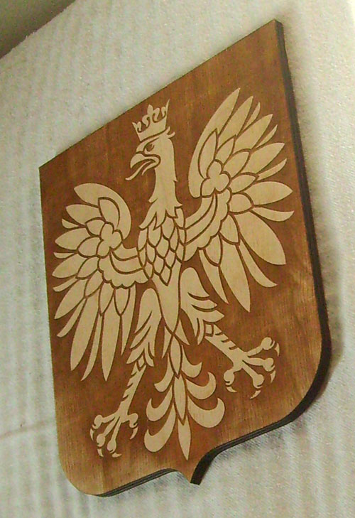 Można poprzez takie wycinanie i sklejanie uzyskać również efekt odwrotny, czyli wgłębienia orła w stosunku do tarczy. Ten efekt jest dużo prostszy w wykonaniu, brak klejenia wielu elementów, i co za tym idzie dużo tańszy. Poniżej pokazane jest taki wariant, przy zastosowanej odwrotności kolorystycznej herbu, ze względu na oszczędność dość drogiego materiału.