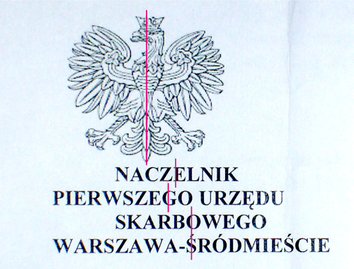 Wygląda paskudnie? Gorzej, po przyjrzeniu się bliżej woła o pomstę do nieba. Bo jakże inaczej określić takie oto justowanie na osi godła i napisu „Naczelnik Pierwszego Urzędu Skarbowego Warszawa-Śródmieście”? Niby proste – Godło + cztery wersy, justowanie do środka, na osi, ale to, co zrobiono w tym wypadku jest ewenementem, co widać poniżej.